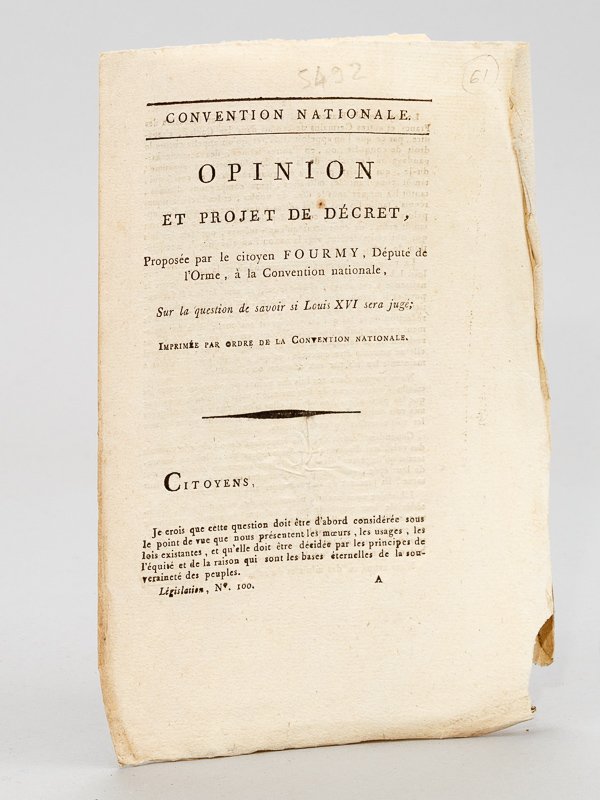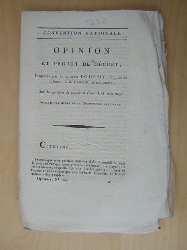 Opinion et Projet de décret, proposée par le Citoyen Fourmy, Député de l'Orme, à la Convention nationale, Sur la question de savoir sur Louis XVI sera jugé
