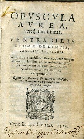 In-8° piccolo (125x76mm), ff. (1), 360, (7), (2) bianche, legatura antica p. pergamena con titolo manoscritto in antico al dorso. Tagli a spruzzo. Impresa giuntina al frontespizio. Testatine e capilettera ornati in xilografia. Registro al colophon. Dedica a stampa di Filippo Giunti a Sante Cini. Una firma di antica mano al margine inferiore del titolo. Lunga annotazione ottocentesca al verso del risguardo anteriore. Ottimo stato. Raccolta di opuscoli mistico-devozionali del presunto autore dell'Imitatio Christi'. Si tratta di una ristampa dell'edizione stampata a Firenze da Filippo Giunti del 1568. EDIT16 CNCE 27497. STC Italian, p. 323. Camerini, I, 2, n. 784. Non in Adams.