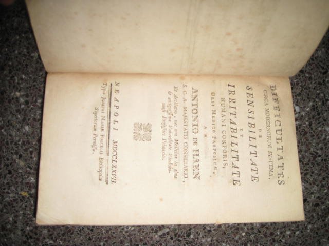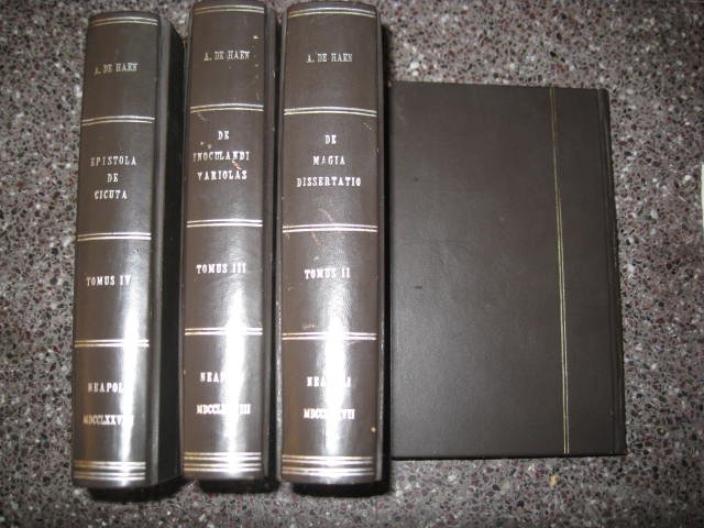 4 voll. in-8° (191x118mm), ognuno dei quali in più parti autonomamente numerate e con autonomo titolo; pp. XVI, 95, 144; XIX, 209; XUV, 134; 44, 57, 240; (2), 37, 72, 40, 53, XVI [pp. V-VIII posposte], 79, 24; legatura moderna in similpelle marrone con titolo e filetti in argento al dorso. Alcuni aloni e bruniture. Buon esemplare. Edizione napoletana degli opuscoli medici (ma sono presenti anche scritture relative alla magia e all'occultismo) del De Haen (L'Aja, 1704-Vienna, 1776), famoso medico olandese allievo di Boerhaave che praticò l'attività clinica prima nella città natia e poi, dal 1754, alla corte di Vienna, su indicazione del Van Swieten, divenendo primo medico di Maria Teresa e insegnando nella locale Università. L'edizione è così ripartita: I) Difficultates circa modernorum systema de sensibilitate et irritabilitate humani corporis. Vindiciae earundem difficultatum contra Alb. v. Haller ad easdem difficultates apologiam.<br>II) De magia dissertatio theologico-physica. De miraculis dissertatio theologico-physica.<br>III) Quaestiones de methodo inoculandi variolas. Item Lud. Tralles De methodo medendi variolas . Eiusdem Vexatissimum nostra aetate De insitione variolarum vel admittenda, vel repudianda , argumentum occasionum quaestionum. .<br>IV) Epistola de cicuta. Item Alethophilorum Viennensium elucidatio. Ant. de Haen ad sibi communicatas observationes. de cicuta Responsio. Ejusdem Responsio ad B. L. Trallès de Variolarum inoculatione, et de sanguinis missione, et oppium in stadio variolarum suppuratio. Item Histor. Anatom. Medica morbi miri incurabilis. Cfr. Blake, p. 192. Wellcome, III, 189.