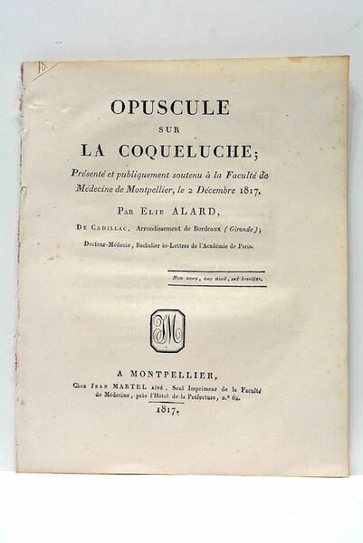 Opuscule sur la coqueluche. Présenté et publiquement soutenu à la Faculté de Médecine de Montpellier, le 2 Décembre 1817.