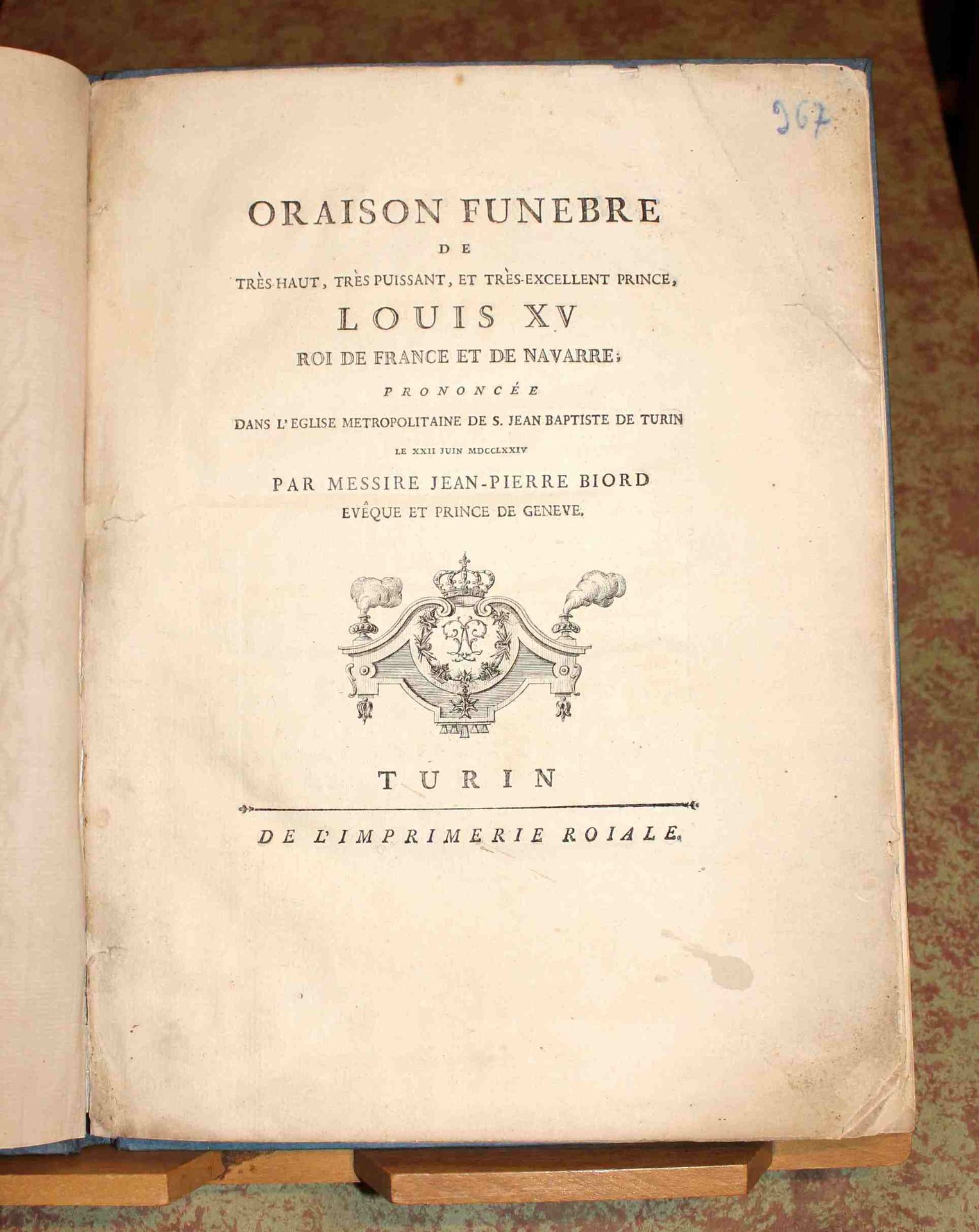 Oraison funebre de très haut, très puissant, et très-excellent prince, Louis XV roi de France et de Navarre. Prononcée dans l'église metropolitaine de S. Jean Baptiste de Turin le XXII juin MDCCLXXIV