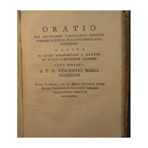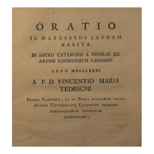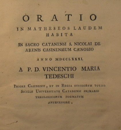 Oratio in Matheseos Laudem Habita in Sacro Catanensi S.Nicolai. + Oratio Pro Auspicandis Generalibus Comitiis Congregationis Siculo-Napolitanae Habita in Sacro Panormitano S. Martini De Scalis….