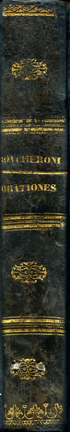 3 voll. in un tomo in-8°, pp. XXII, (1), 264, legatura coeva m. pelle con titolo, fregi e filetti in oro al dorso. Piatti cartonati in marmorizzatura policroma. Tagli azzurri a spruzzo. Seguono: Tommaso Vallauri, 'De Latinis Christianae Sapientiae Scriptoribus Oratio habita studiis rite auspicandis in Auditorio Maximo Regii Archigymnasii Taurinensis III non. Novembr. an MDCCCLV', Augustae Taurinorum, Ex Officina Regia, 1855, pp. 64. Le orazioni sono per la ricorrenza della nascita di Vittorio Emanuele, sulle lettere greche, per la nascita di Carlo Felice. [Pier Alessandro Paravia], 'Orazione pel riaprimento degli studi nella Regia Università di Torino l'anno MDCCCLIV - Della responsabilità dello scrittore, orazione recitata nella grande Aula della Regia Università di Torino ai III Novembre MDCCCLIV', Torino, dalla Stamperia Reale, 1854, pp. 78. Ottimo stato, salvo fioriture usuali. Di seguito alla terza opera, nelle due ultime carte bianche, fitte annotazioni del tempo sia a penna che a matita; le annotazioni a pennino contengono un'Epigrafe relativa a questa grande e coraggiosa orazione del prof. Paravia', stesa in latino dal proprietario ottocentesco. Tre rare orazioni volgari e latine, in edizione originale, di illustri figure dell'Ateneo torinese dei primi decenni del XIX secolo.