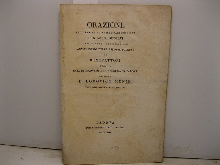 ORAZIONE recitata nella chiesa parrocchiale DI S. MARIA DE' SERVI NEL GIORNO 17 FEBBRAIO 1824 anniversario delle esequie solenni ai benefattori della Pia casa di Ricovero e d'Industria in Padova
