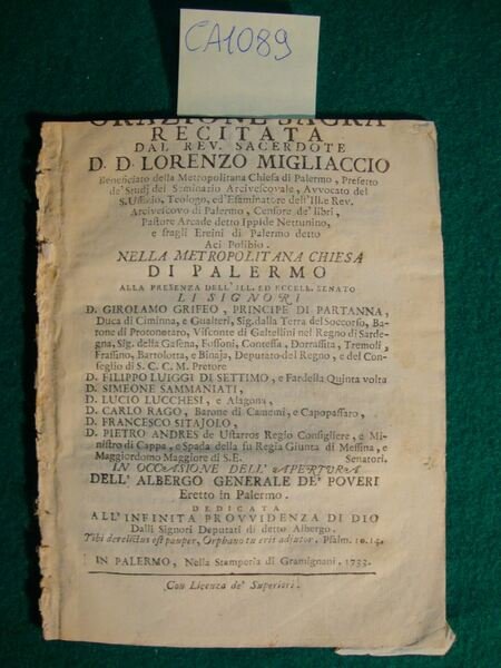 Orazione Sacra del Rev. Sacerdote D. D. Lorenzo Migliaccio nella Metropolitana Chiesa di Palermo in occasione dell'apertura dell'Albergo Generale dei Poveri eretto in Palermo