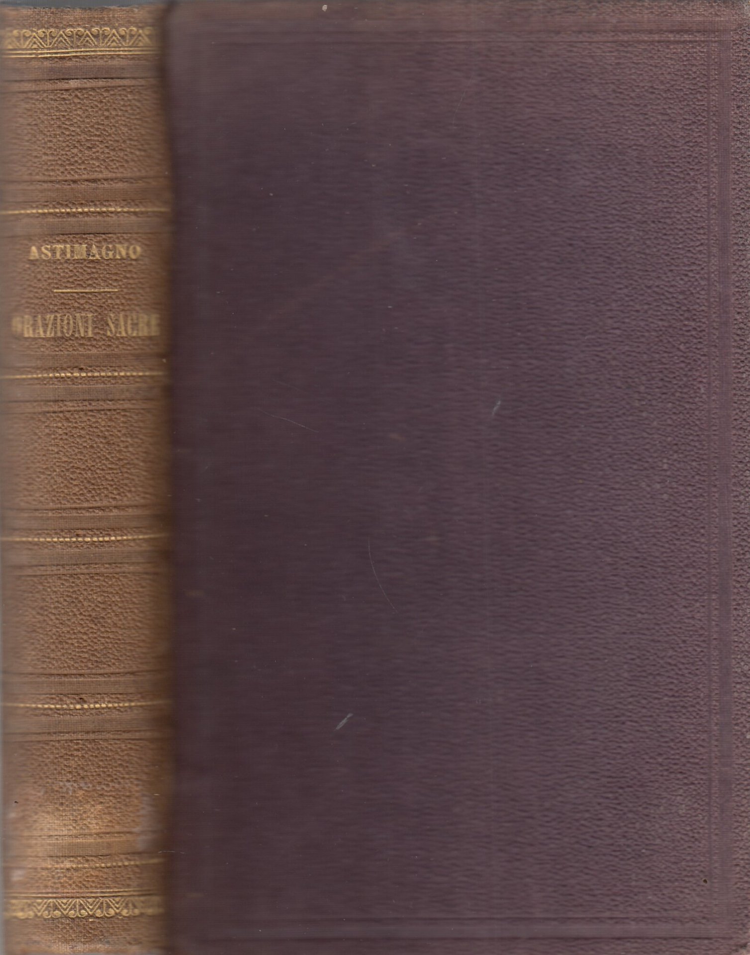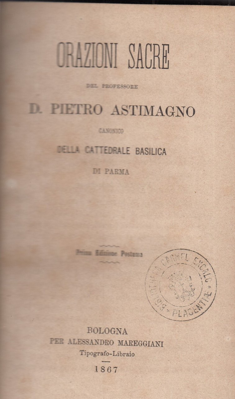 Orazioni Sacre. Del prof D. Pietro Astimagno canonico della cattedrale basilica di Parma. Libro usato proveniente da colllezione privata. La copetrtina riporta tracce d'uso e le pagine sono imbrunite dal tempo e con inizi di fioritura. Polvere ai tagli. in dodicesimo Buono (Good) Libro usato proveniente da collezione privata. La copertina riporta tracce d'uso. Le pagine risultano delicatemente imbrunite dal tempo e con inizi di fioritura. Polvere ai tagli. Timbro di appartenenza a collezione privata..