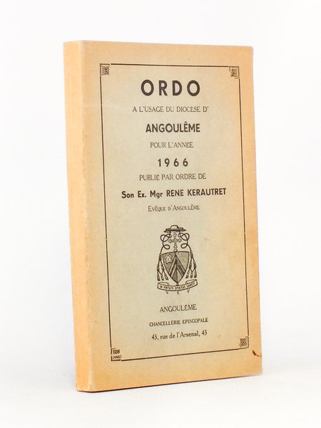 1 vol. in-12 br., Chancellerie épiscopale, Angoulême, 126 pp. + 100 pp. d'info. sur le clergé + ff. de réclames. Bon état (petit accroc réparé sur plat inf. très bon état par ailleurs) pour cet ordo. Outre l'ordo au sens strict (i.e. le calendrier liturgique), cet ordo donne de très nombreuses informations sur l'église catholique de France et du diocèse d'Angoulême en 1966. Mgr. Kerautret (1906-1995) fut évêque d'Angoulême de 1965 à 1975.