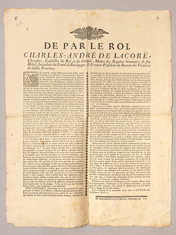 1 placart format 47 x 37 cm, 1773 : [Ordonnance faite à Oyrières le 10 novembre 1773, concernant les communautés de Merey & de Marloz ] De par le Roi, Charles-André de Lacoré, Chevalier, Conseiller du Roi en ses Conseils, Maître des Requêtes honoraires de son Hôtel, Intendant du Comté de Bourgogne, & Premier Président du Bureau des Finances de ladite Province. Etat très satisfaisant (ancienne restauration en pliure au verso)