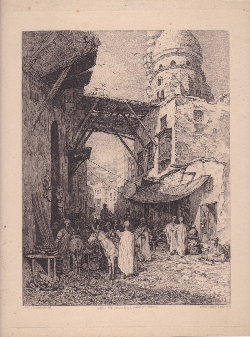 Original-Radierung des Künstlers aus dem Jahr 1899. Die Radierung zeigt eine seltene Ansicht aus dem lebendigen Kairo und wurde in der Platte vom Künstler signiert und datiert. Die Radierung selbst hat die Maße 23,3 x 17,6 cm. Seltene Berliner Original-Graphik!