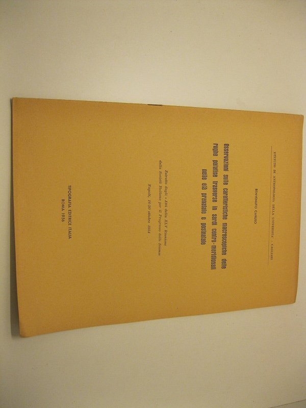 Oseervazioni sulle caratteristiche macroscopiche delle rughe palatine trasverse in sardi centro-meridionali nelle eta' prenatale e postnatale. Estratto dagli 'Atti della XLV Riunione della Soc. It. per il Progr. delle scienze. Napoli, 16-20 ott. 1954 Istituto di antropologia della Universita' - Cagliari