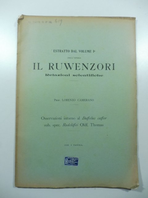Osservazioni intorno al Buffelus caffer sub. spec. Radcliffei Oldf. Thomas. Estratto dal volume I dell'opera Il Ruwenzori