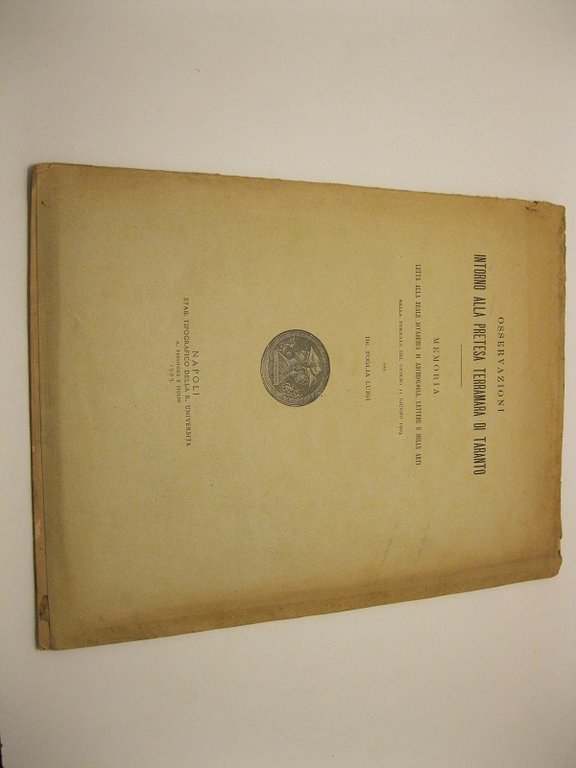 In 4, pp. 30. Manca lembo del f. con perdita di alcune lettere del titolo. Br. ed. Estr. da Atti dell'accademia di archeologia lettere e belle arti. Notizie relative agli scavi realizzati in Taranto, localita' detta Scoglio del tonno, presso la stazione ferroviaria.
