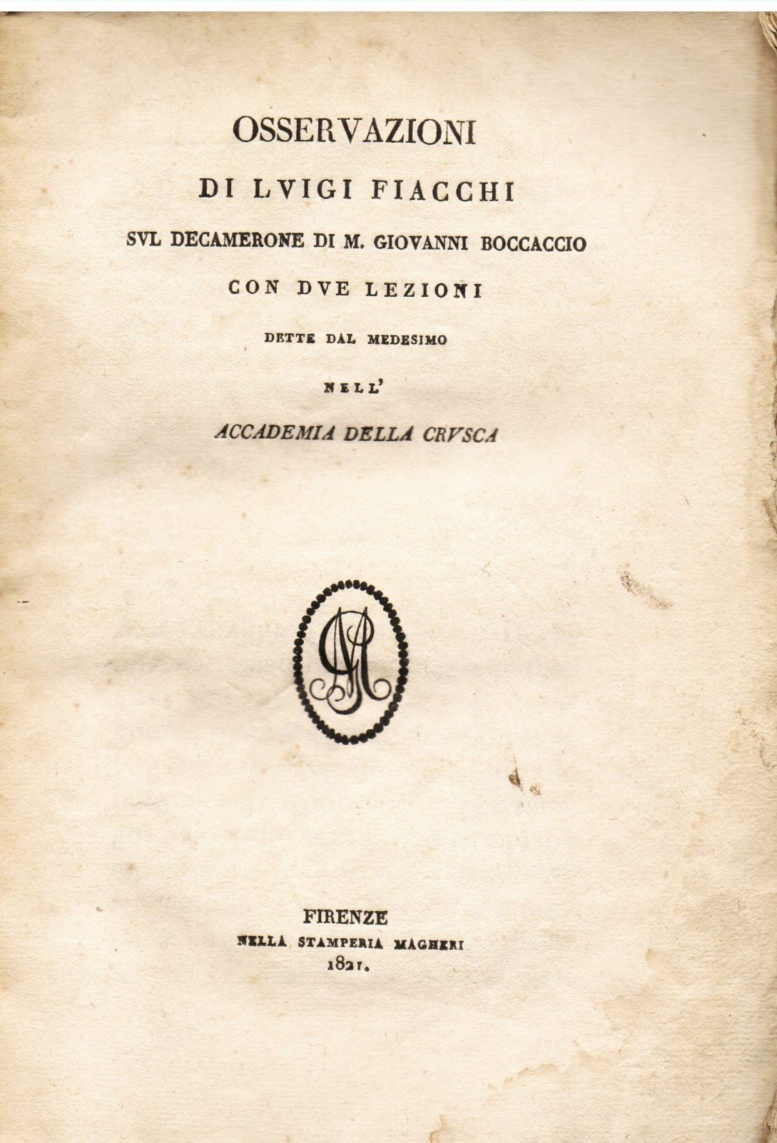 In-8°, pp. VIII, 159, brossura muta coeva. Dedica a stampa a Michele Colombo. In barbe, con sparsi aloni marginali e qualche brunitura. Edizione originale di queste considerazioni flologico-linguistiche sul testo del Decameron condotte dal punto di vista del purismo cruscante. Il Fiacchi (Scarperia, 1754-Firenze, 1825), Accademico della Crusca, sacerdote, filologo, è noto oggi soprattutto per le sue favole in versi, pubblicate con lo pseudonimo 'Clasio'. Gamba, 191 (note): 'Dotta operetta'. Traversari, 83.