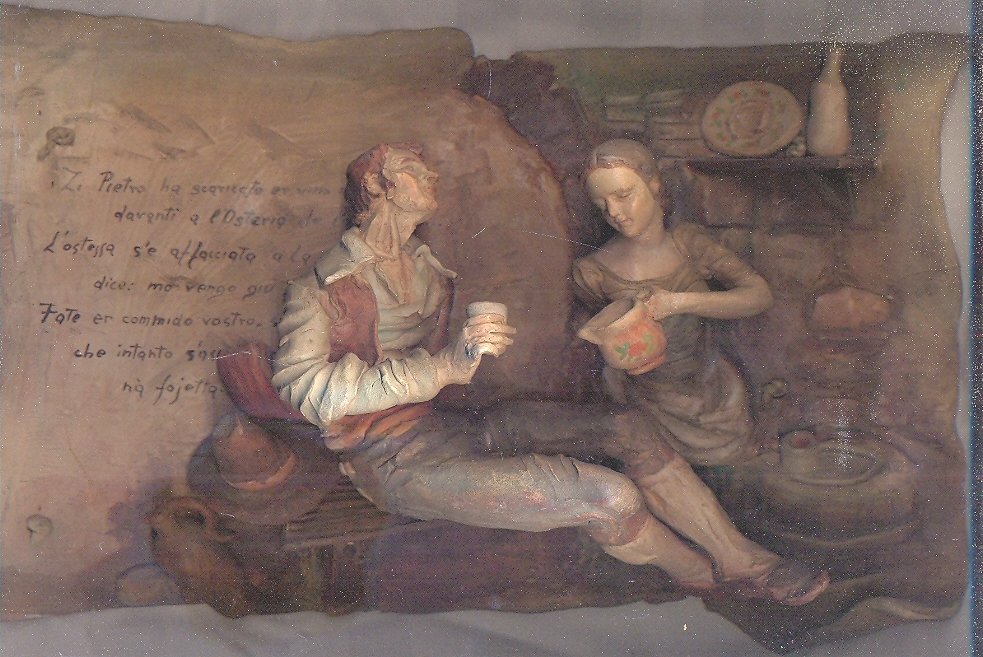 Mattonella in ceramica con due personaggi in rilievo con, a sinistra, scritto uno stornello romanesco. Misure di massimo ingombro: altezza cm. 23, lunghezza cm. 33.