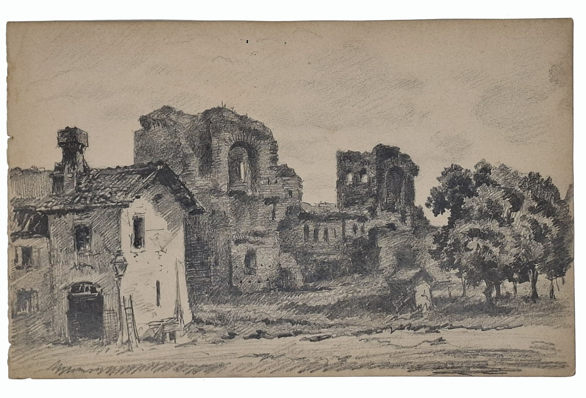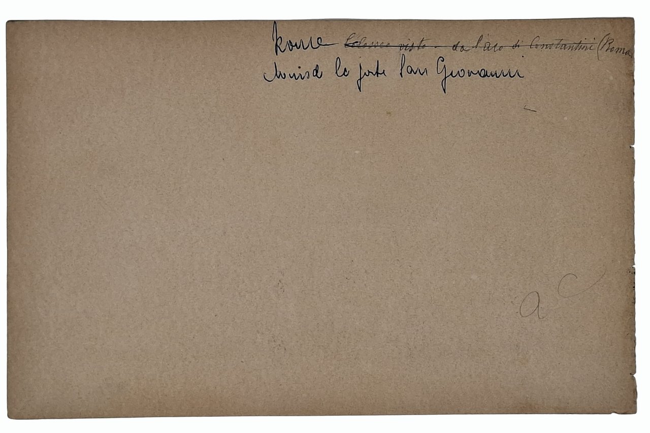 Disegno originale, a matita, ritraente, come indicato da una scritta sul margine superiore del retro del foglio, uno scorcio di Roma e, in particolare la Porta di San Giovanni. L'opera è stata realizzata su un foglio da disegno di taccuino (presumibilmente, dato il tipo di carta, realizzato apposta per pittori). Dimensioni del foglio: 15 x 23,5 cm circa. Il disegno, realizzato con notevole maestria, non presenta firme o indicazioni di data ma, presumibilmente, è stato realizzato nella seconda metà dell'800 da un pittore (probabilmente di origine francese) in viaggio. Era, in effetti, assai comune che all'epoca pittori stranieri soggiornassero brevemente nelle varie località italiane per ampliare le loro conoscenze dell'arte. Quest'ipotesi si basa anche sul fatto che abbiamo a disposizione più disegni di stessa provenienza con scorci di varie località italiane. Stato di conservazione: leggeri segni di distacco dal taccuino sul margine verticale sinistro ma, nel complesso, decisamente buono. Opera sicuramente piacevole, oltre che storicamente interessante, degna di essere inquadrata ed esposta.