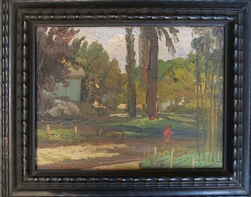 Grazioso dipinto ad olio su tavola di compensato. Paesaggio boschivo con piccola figura a passeggio. (Sul retro scritto a lapis il nome del presunto autore:- M. Shoeusy). Misura della tavola, cm,22,5x16, montata su cornice originale ebanizzata).