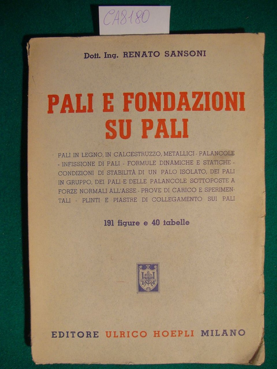 Pali in legno, in calcestruzzo, metallici - palancole - infissione di pali - formule dinamiche e statiche - condizioni di stabilità di un palo isolato, dei pali in gruppo, dei pali e delle palancole sottoposte a forze normali all'asse - prove di carico e sperimentali - plinti e piastre di collegamento sui pali. Con 191 figure in b.n. n.t. e 40 tabelle - DETTAGLIO DELLE CONDIZIONI : Segni d'invecchiamento alla coperta con minuti e marginali strappetti ai piatti e danno con carenza al dorso. Minute macchie in coperta. Alcuni segni da studio sparsi alle pagine - .