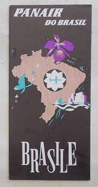 Pieghevole di 16 facciate di cm. 22 x 10; con cartina delle rotte interne al Brasile su due facciate, illustraz. fotograf. in nero e disegni in colore; copertina grafica a colori firmata A. Pereira. VG.