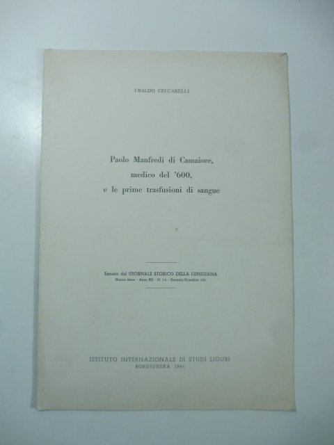 In 8 (cm 18,5 x 26,5), pagine numerate da 209 a 215 (7 pagine di testo in totale). Brossura editoriale. Estratto editoriale dal Giornale storico della Lunigiana.
