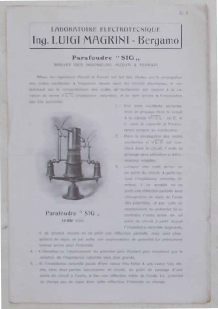 Parafoudre "SIG" Brevet des Ingeniurs Pizzuti & Ferrari. Laboratoire Electrotechnique Ing. Luigi Magrini. Bergame.