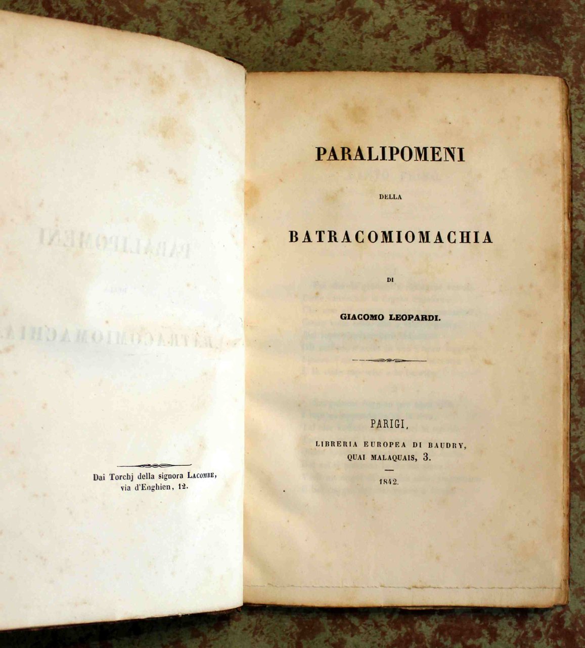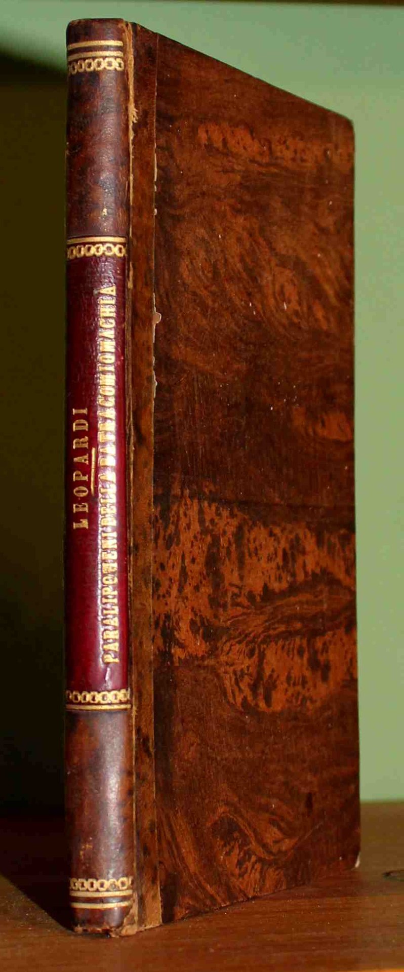 In 16°, pp. 136. Mezza pelle dell'epoca con titoli oro sul dorso. Brossure editoriali conservate all'interno. Qualche fioritura ma copia molto buona. Ristampa dell'originale edizione parigina, riconoscibile da alcune correzioni al testo, dalla mancanza dell'errata e dalle brossure, stampate su carta rosa, come quelle della Biblioteca Nazionale. Cfr. Parenti, 309.