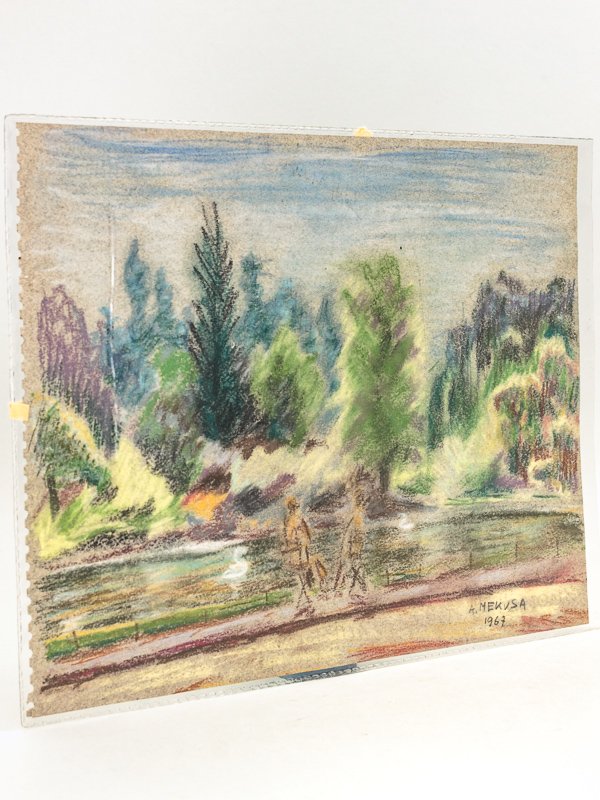 1 pastel sous passe-partout, format , signée A. Mekusa, daté 1967, avec son cachet A. Mekusa Artiste peintre Paris au verso (du pastel et du passe-partout), portant au verso, au stylo la mention : 1009 Parc Montsouris avec lac Bon exemplaire.