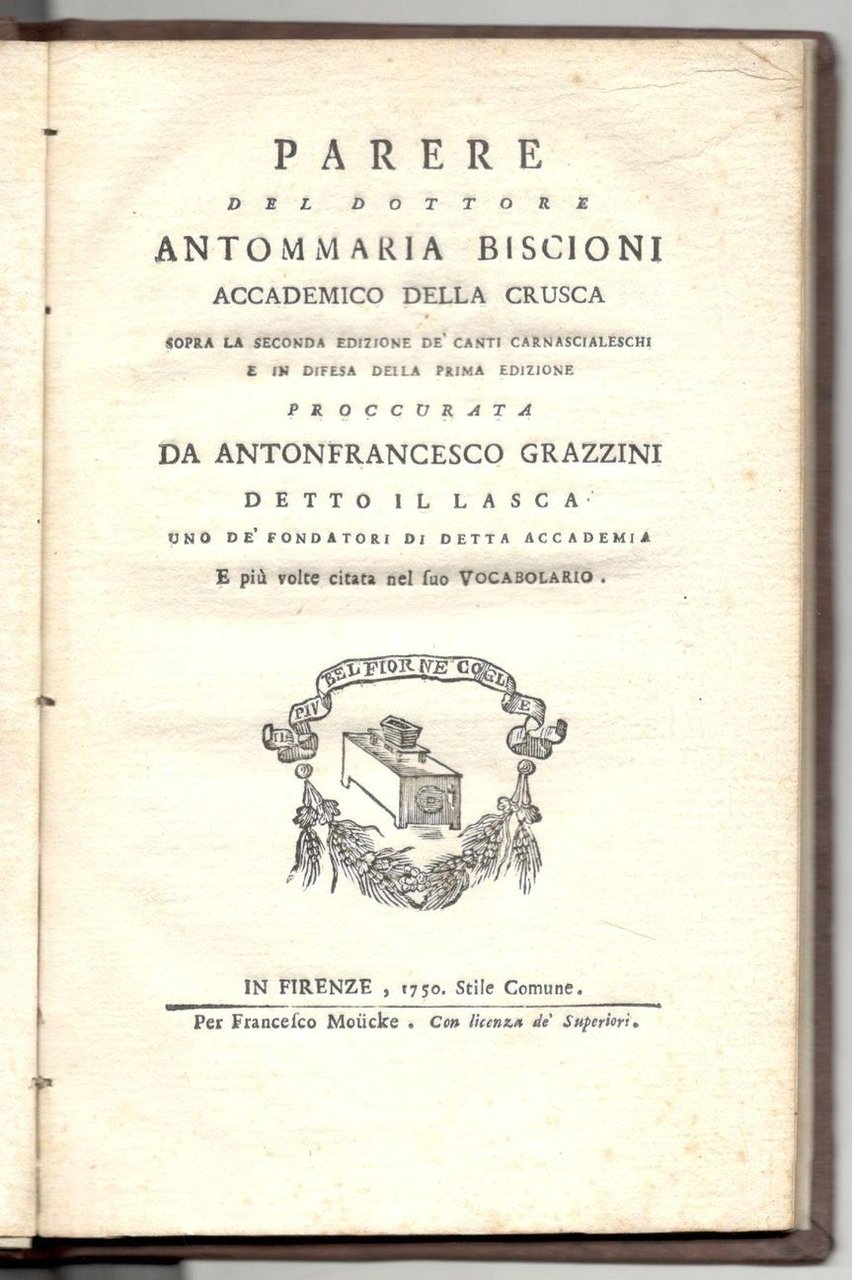 Parere del dottore Antommaria Biscioni sopra la seconda edizione de' Canti Carnascialeschi e in difesa della prima edizione proccurata da Antonfrancesco Grazzini detto il Lasca uno de' fondatori di detta Accademia e più volte citata nel suo vocabolario