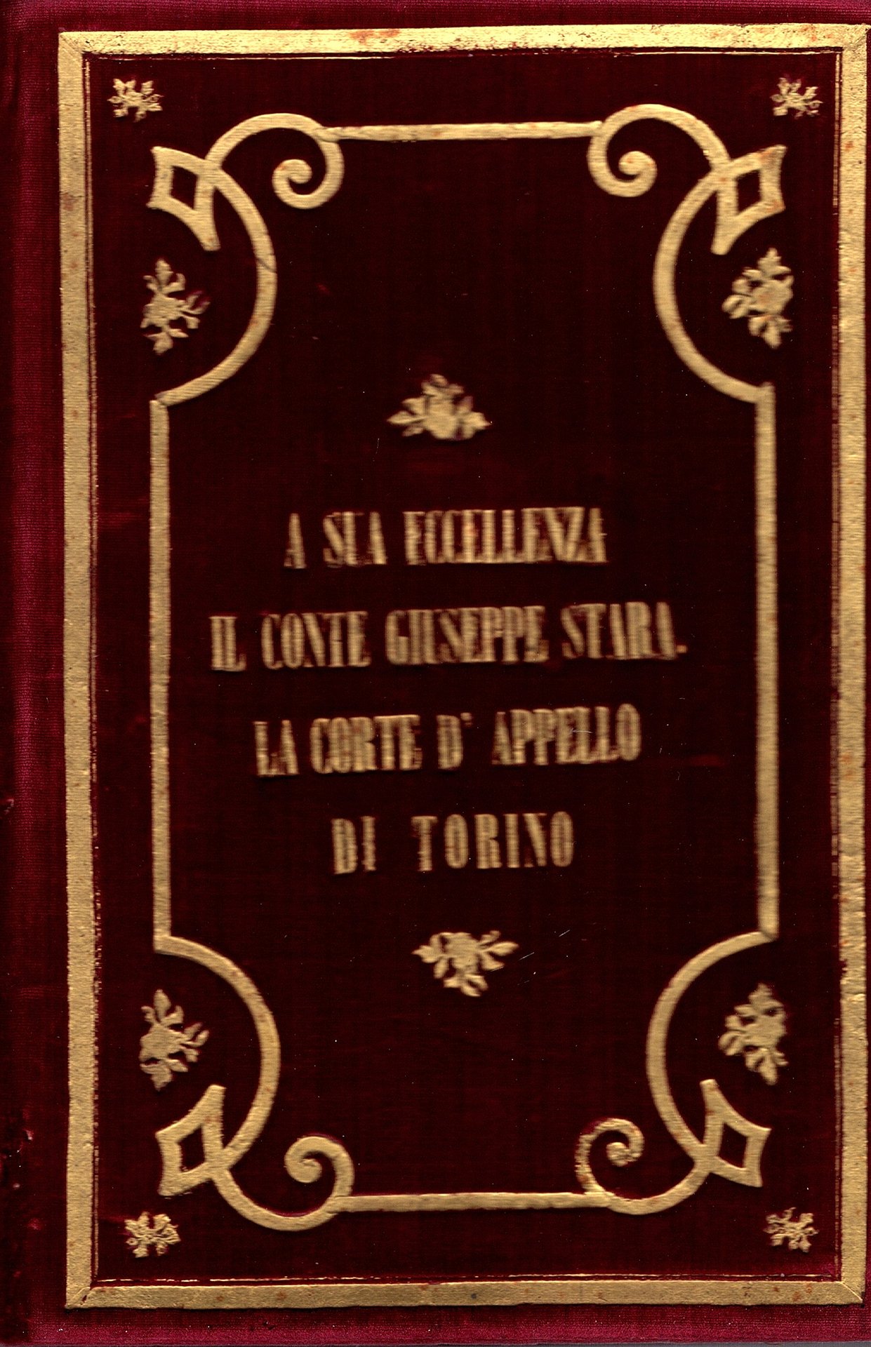 In-8° (24x16 cm), elegante raso editoriale coevo con dedica supra libros al Conte Giuseppe Stara al piatto anteriore entro riquadro e cornice il tutto impresso a secco e dorato. Pp 47, (1). Ottimo esemplare. Discorsi tenuti dal Procuratore Generale Michele Di Lessolo di Castellamonte e da Edoardo Castelli per l'insediamento di quest'ultimo nella carica di Primo Presidente della Corte d'Appello di Torino come successore del Conte Giuseppe Stara innalzato alla carica di Presidente della Corte di Cassazione. Non comune.