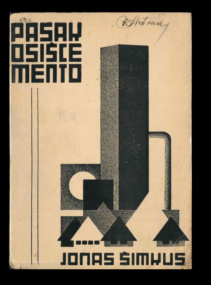 LIBROFirst edition.A good to very good copy.The second collection of avant-garde poems by Šimkus, founder, editor and writer of the magazine «Trečias Frontas». 1000 copies were printed, according to the National Library of Lithuania record. Since the opening poem, «Programa», what catches the eye is a strong modernist imaginary (factories, offices, urban landscape details, «Aš programą iš plieno atlieju» [I have a program of steel castings, p. 5]) employed to convey political and nationalist messages, with references to the Bolshevik mith (e.g. the metaphor «kaip bolševikų šaudomi buržujai» [as the Bolsheviks shot bourgeois, p. 7]). But also lyrical and intimate verses can be found, often enlivened by a constant reference to a strictly contemporary, pop-urban imaginary (traffic lights, sirens, robots, machines, offices, chimneys.). One of the longer poems, divided into two rooms, is entitled «Apie raštinę [The Office]», and it is all about dehumanized life of the modern work, a sort of “tertiary nightmare”. Another poem entitled «Apie kubišką meilę [Cubital love]» mentions lead triangles, aluminium cubes and «dynamic machines». The ending poem is dedicated to the renown Lithuanian realist writer Petras Cvirka (1909-1947), who collaborated extensively to «Trečias Frontas». Remarkable the stunning art work by JJ Burba to the front cover, a modern city landscape stylized as a rationalist/constructivist/futurist composition.Salaris, Futurisms in the World, p. 674