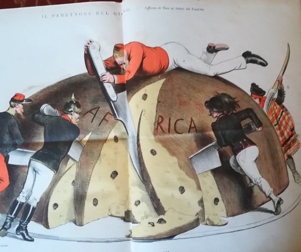In folio piccolo, annata completa formata da 52 fascicoli di 8 pagine ciascuno con una bella litografia a colori disposta su doppia pagina. Legatura coeva in mz pelle con titoli in oro al dorso. Celebre rivista umoristica riccamente figurata da litografie in nero e da tavole f.t. in nero disegnate da Teja. Non comune.