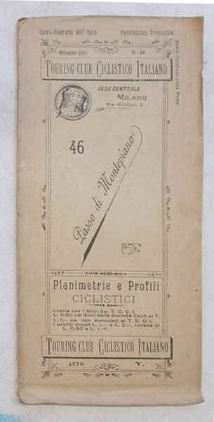 Tavola di 16 facciate di cm. 21 x 8,5 (perciò lunga cm. 136 circa). VG. ** Verificato sul terreno nel luglio 1899. Le "Planimetrie e profili ciclistici" del Touring Club Ciclistico Italiano sono una collezione di pubblicazioni che ha qualcosa, anzi è più esatto dire molto! di epico: i 57 itinerari, pubblicati in 51 fascicoli tra il 1896 e il 1901, Luigi Vittorio Bertarelli, il fondatore del T.C.I., se li è fatti tutti in bicicletta, appuntando ogni informazione utile su un taccuino. Ogni itinerario è descritto su una lunga tavola, che si svolge orizzontalmente e che è ripiegata in una copertina con titoli, fregi e piccolo stemma del T.C.C.I. La tavola presenta un profilo altimetrico a tre colori e la cartina dell'area, con il tracciato evidenziato in rosso. Il profilo, oltre alle quote, contiene l'indicazione delle distante, della qualità delle strade (polverose, discrete, buone.), delle tappe e altre notizie utili (sorgenti, "splendido panorama", hotel, ristoranti, servizi postali.).