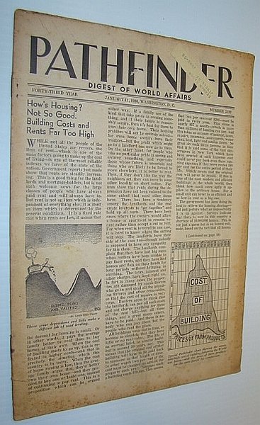 - Pathfinder Magazine - A Weekly Digest of World Affairs From the, Nation's Capital, January 11, 1936 - Italy-Ethiopia War Drags On Housing? - Not So Good -, Building Costs and Rents Far Too High, Lindbergh's Third Flight, Neutraligy Laws and Treaties, Wagner Labor Act at Court, Foreign News, Chinese Vice-Minister of Railways Tang Yu-jen assassinated, Ethiopian Situation Still Cloudy and Italo-Ethiopian War Drags, On, Current Events, Illustration of Rep. James P. Buchanan of Texas, Illustration of Brig. Gen. F.M. Andrews, Commander of the GHQ Air Force, National News, Off-Year Election results Not Always Reliable Forecasts, Is a World Crisis Near?, Marketing, Captain Anthony Eden, Britain's new Foreign Secretary, Illustration of Rep. John M. Bankhead, Science News, Vintage ads, including back cover ad for the McCleary Sanitarium and Clinic, of Excelsior Springs, MO Americana History Magazine Back Issues