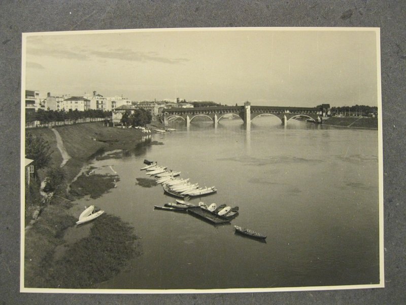 Due fotografie originali in b/n vintage, stampa alla gelatina ai sali d'argento, didascalia manoscritta al verso cm 17,5 x 12,5 montate su cartoncino bordato cm 24,7 x 17. Entrambe ritraggono il Ticino a Pavia, nella prima si vede il ponte coperto, nella seconda il fiume, parte del ponte e ampio scorcio sulla citta'.