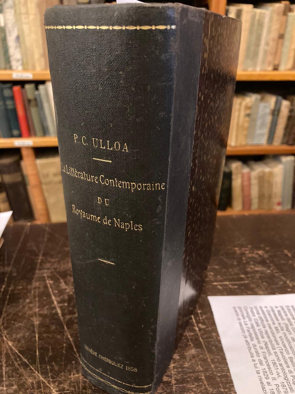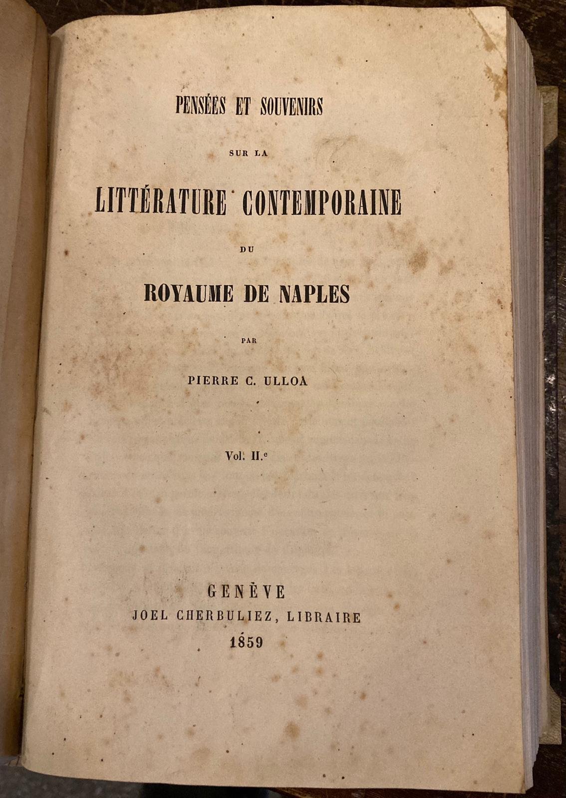 Due volumi in-8° grande (22x15 cm) legati insieme in un tomo in mezza tela fine ottocentesca con angoli, titoli e fregi dorati al dorso, piatti rivestiti carta marmorizzata. Pp 381, (3); 539, (3). Lievi difetti al primo frontespizio; difetti alle ultime due pagine non numerate del primo volume (restauri integrativi); secondo frontespizio lievemente brunito. Peraltro interno fresco e croccante. Buon esemplare. Edizione originale di questo imponente studio sulla cultura letteraria (e non solo) napoletana a partire dalla conquista del regno di Napoli da parte di Carlo III e l'inizio della dinastia di Borbone a Napoli (Regni de Carlo III e Ferdinando IV). Contiene notizie e considerazioni di grande interesse sulla modificazione della lingua colta, sulle poetesse Giuseppina Guacci, Rosa Taddei e Giannina Mili, Vincenzo Bellini, dramma musicale di Saverio Mercadante, sugli storici, sulla questione meridionale (Tavoliere di Puglia), sulla geologia (Leopoldo Pila), etc. Parecchi autori di ormai difficile reperibilità sono antologizzati e discussi ex vivo. Utile indice dei nomi in fine. Pietro Calà Ulloa (Napoli, 1801-ivi, 1879), fedelissimo ai Borbone, fu l'ultimo Presidente del Consiglio napoletano di Francesco II. Poligrafo e giornalista (fondò, e scrisse quasi da solo, il giornale La Farfalla, durato dal 1829 al 1831 fu avvocato di fama e poi magistrato per circa un quarto di secolo (è attribuita a lui la rivelazione a livello pubblico del termine 'mafia').