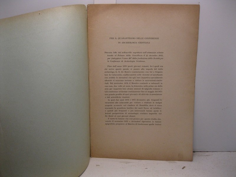 In 8, pp. 223-229 + (1b). Br. ed. Estratto dal Nuovo Bullettino di Archeologia Cristiana, anno XXII (1916). Testo del discorso letto da Marucchi in occasione della riunione tenutasi al Palazzo della Cancelleria per festeggiare il 40o anno della fondazione della Societa' per le Conferenze di Archeologia Cristiana.