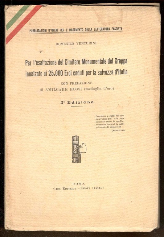 Per l'esaltazione del Cimitero Monumentale del Grappa innalzato ai 25.000 Eroi caduti per la salvezza d'Italia. Con prefazione di Amilcare Rossi (medaglia d'oro)