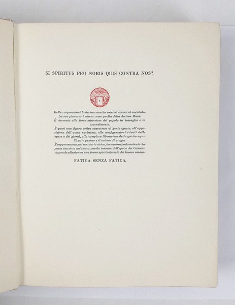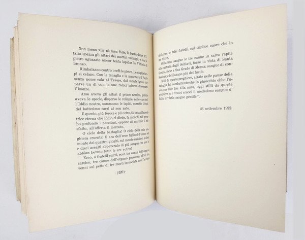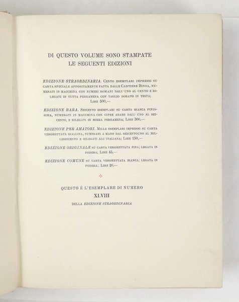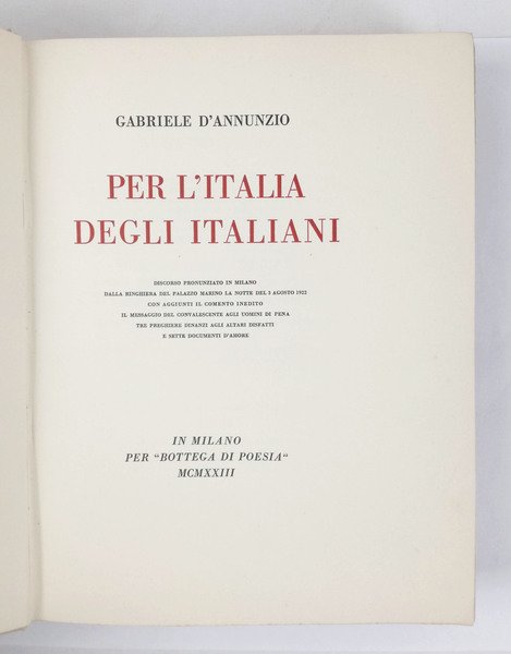 LIBROBellissimo esemplare.Esemplare n XLVIII dell’«edizione straordinaria» di 100 copie su carta speciale appositamente prodotta dalle Cartiere Binda del discorso pronunziato a Milano dalla ringhiera del Palazzo Marinola notte del 3 agosto 1922.Guabello, Raccolta dannunziana, n. 325