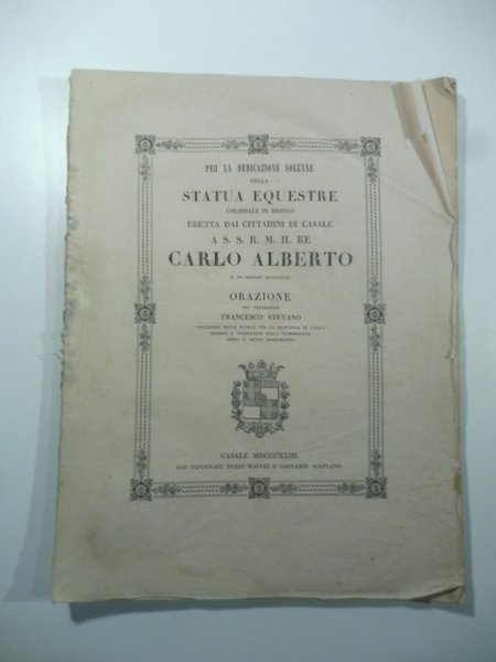 In 4 (cm 22,5 x 30), pp. XXXIII. Brossura editoriale. Poco comune pubblicazione relativa all'inaugurazione della statua di Carlo Alberto scolpita da Abbondio Sangiorgio ed eretta a Casale Monferrato. L'Amministrazione Comunale commissiono' allo scultore Abbondio Sangiorgio (Milano 1798-1879) il monumento equestre al re sabaudo come tangibile ringraziamento per aver scelto, nel 1838, la citta' quale sede della seconda Corte d'Appello del Piemonte e la costruzione del primo ponte sul Po.