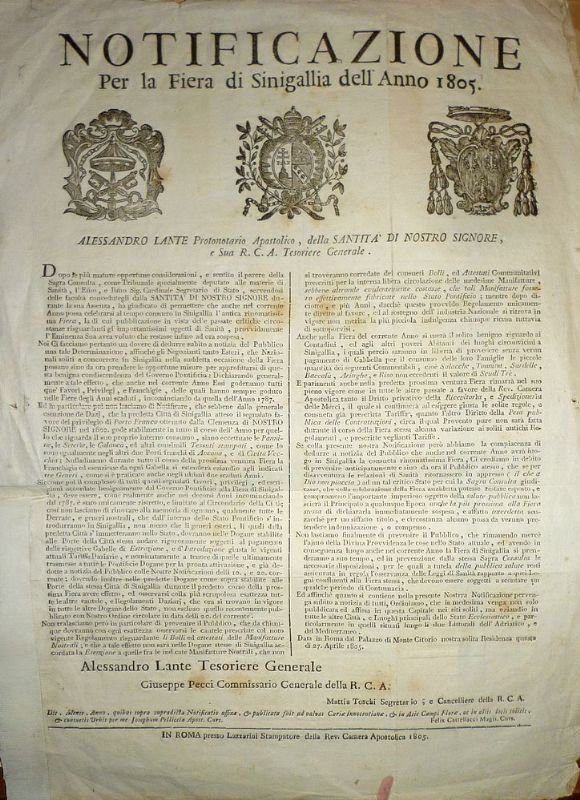 Foglio di cm 52 x 38, con in alto tre stemmi xilografici, suguiti dal testo su due colonne. Alessandro Lante, Tesoriere Generale, rende noto che 'l'antica rinomatissima Fiera' della città, sospesa fino ad allora per ragioni sanitarie, avrà nuovamente luogo, con 'tutti que' Favori, Privilegj, e Franchigie, delle quali hanno sempre goduto nelle Fiere degli Anni scaduti' i 'Negozianti, tanto Esteri, che Nazionali'. Mancanza al margine bianco sinistro di cm 20 x 3 circa. Vecchi segni di piagatura ed altre marginali tracce del tempo.