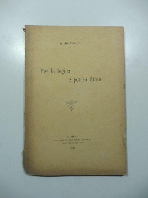 In 8 (cm 13 x 19,5), pp. 76. Brossura editoriale con lievi danni riparati al dorso. "Il Monnosi e' un revisore della Camera dei Deputati colto, cupo, laborioso, osservatore, profondamente malcontento, e che col suo opuscolo ci si rivela schietto e sincero. "Per la logica e per lo stato" s'impone a chi delle pubblicazioni contemporanee ricerca la origine nella psicologia collettiva, perche' i consigli, i giudizi, gli allarmi contenuti nel libretto si sentono ripetere qua e la' nei giornali, nei discorsi dei caffe', delle farmacie sono, per cosi' dire, nell'aria e l'autore ha avuto il merito di raccoglierli, condensarli e presentarli al pubblico con singolare chiarezza e con sincerita' rarissima " (Rivista popolare di politica, lettere e scienze sociali, p. 281).