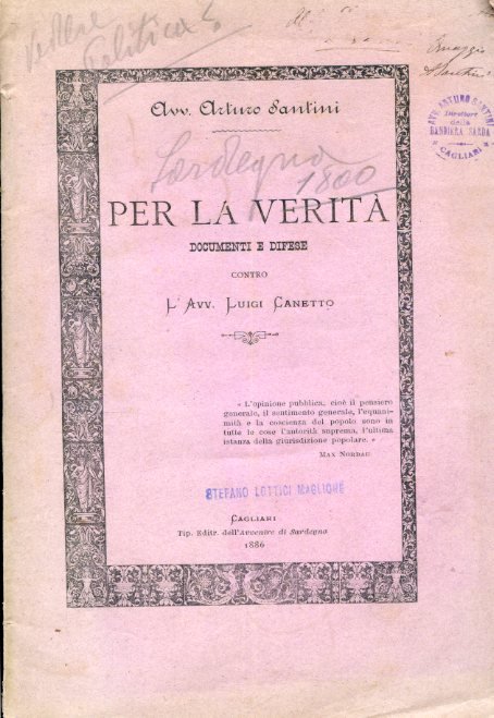 In-8°, pp.125, brossura editoriale rosa con titolo entro bordura. Dedica autografa dell'autore, direttore della 'Bandiera Sarda' ed avvocato, e suo timbro privato al piatto. Bell'esemplare. Non in Ciasca.