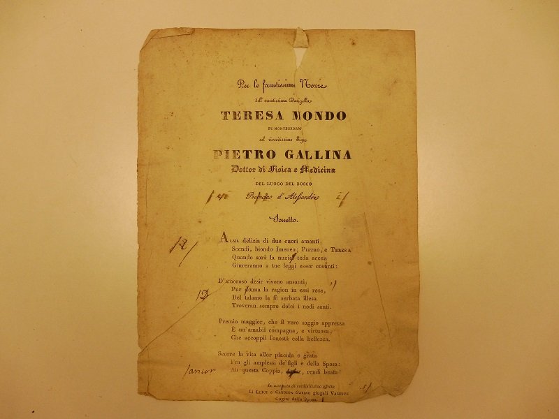 Foglietto (cm 18,5 x 24,5). Strappetto al margine superiore del foglio. Alcune correzioni con segni grafici ai lati del testo. Sonetto scritto da Luigi e Candida Garino e pubblicato in occasione delle nozze fra Teresa Mondo di Montegrosso e Pietro Gallina di Bosco Marengo (Alessandria).