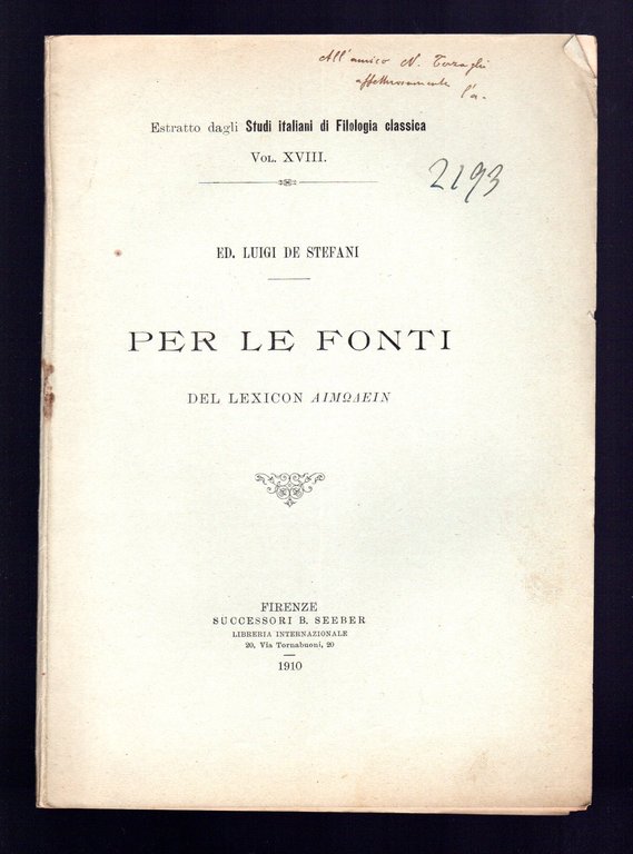 Opuscolo vintage. Estratto dagli Studi italiani di Filologia Classica vol. XVIII. Dedica autograga dell'autore. Segni di biro in copertina. Usura da scaffale. Ordinario segno del tempo.