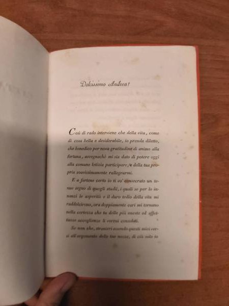 in-8, pp. 21, leg. cartone edit. colorato. Lunga dedica dell’A. che compone per l’occasione i due carmi “Le due scuole” e “Il desiderio”. Lieviss. fioriture sulle prime 6 pagine e gora al piatto post., ma bell’esempl. [077]