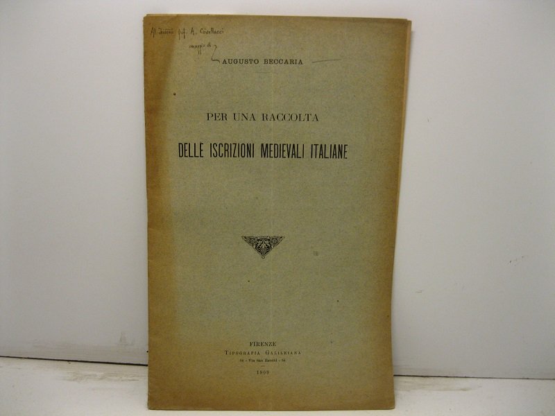 In 8, pp. 15 + (1b). Dedica dell'A. al p. ant. Br. ed. Estratto dall'Archivio Storico Italiano, serie V, tomo XLIII, disp. 1o dell'anno 1909. Ipotesi per la creazione di un corpus che riunisca tutto il patrimonio epigrafico medievale che possa in parte proseguire la gigantesca impresa dell'Accademia di Berlino.