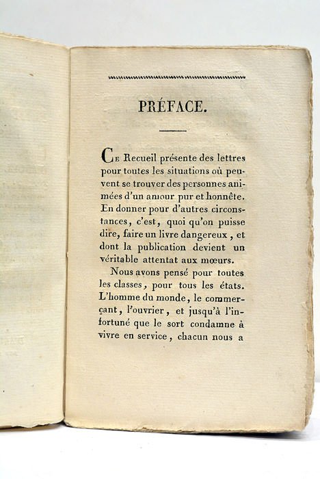 Frontispice. 162 pages. (14,5x9,5 Cm). Broché. Couverture muette de l'époque en papier moucheté. Importants manques au dos. Plis et petits accrocs. Très rare manuel épistolaire proposant des exemples de correspondance amoureuse: déclarations d'amour, demandes en mariage avec des réponses favorables ou non. Rares taches et rousseurs. Exemplaire bien conservé.