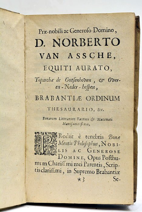 4 feuillets. 200 pages. 4 feuillets. (16,5x10 Cm). Parchemin de l'époque. Titre manuscrit au dos. Coins et coiffes émoussés. Petits trous de vers sur le deuxième plat. Taches et salissures. Ouvrage philosophique et moral de Ioannes Walhorn, dit Deckher, conseiller au Senat de Brabant. Sa publication posthume est due à Conradus Aquila Deckher, fils de l'auteur. Portrait de l'auteur en frontispice. Mouillure légère sur une trentaine de pages.