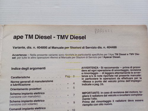 Piaggio APE TM DIESEL 1987 motocarro VARIANTI manuale officina Apecar Diesel