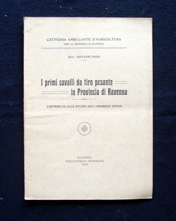 Dott. Giovanni Piani, I primi cavalli da tiro pesante in Provincia di Ravenna Contributo allo Studio dell'indirizzo Ippico Tip. Lit. Ravegnana; 1915; cm. 24x17; pp.53; br ed. con ill. fot. b/n. Dedica autografa dell'autore( vedi foto). Condizioni di conservazione Esemplare in buono stato con leggere tracce d'uso e del tempo; br. con leggere bruniture, piega conservativa. OPEB.4448 blu