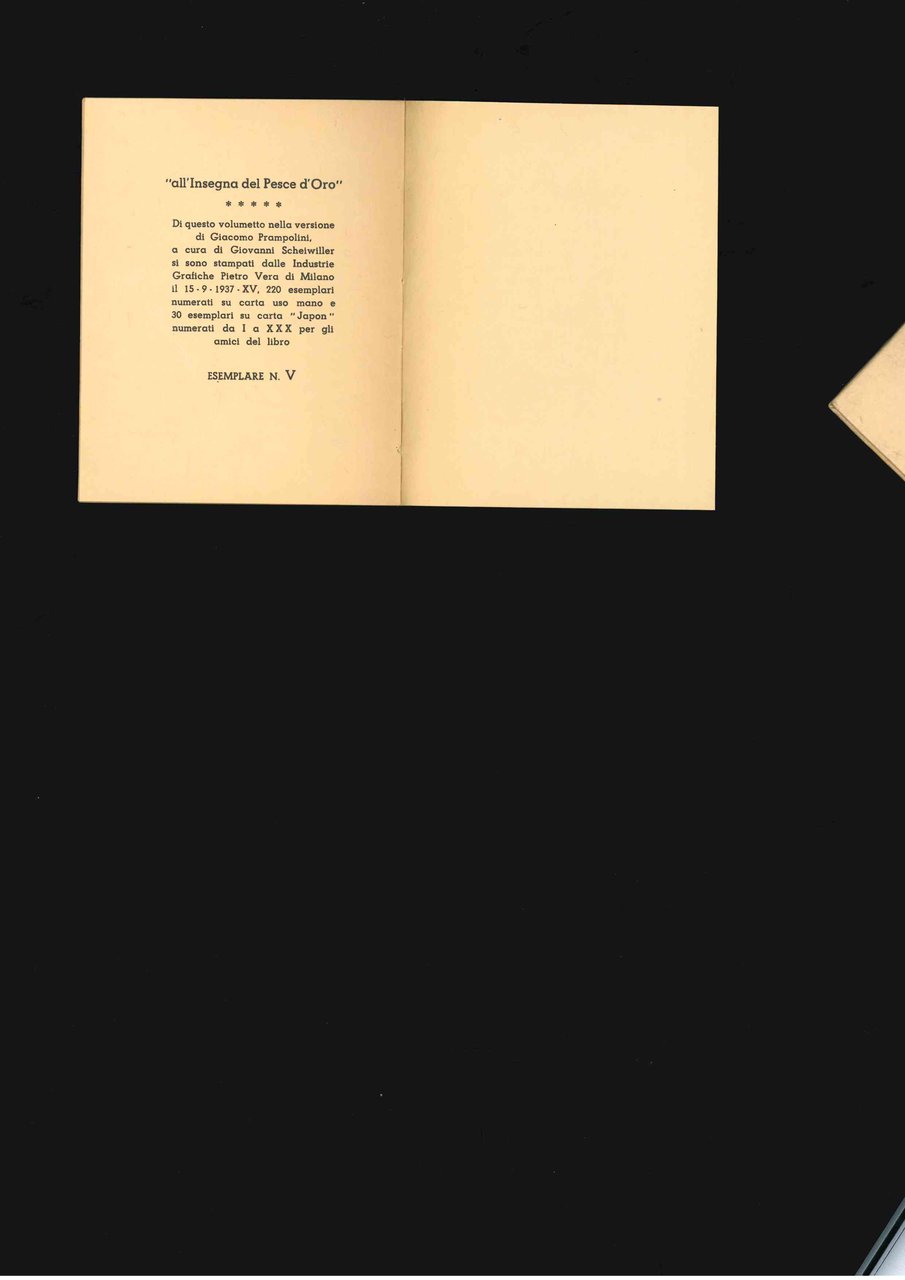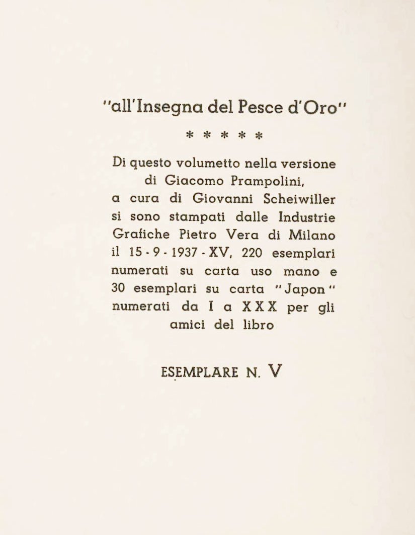 - [in fine:] “all’insegna del Pesce d’Oro” (di Giovanni, Scheiwiller, Ind. grafiche Pietro Vera),